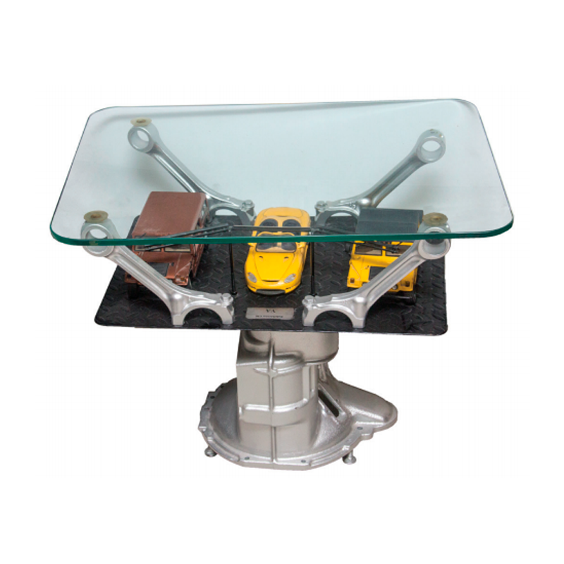 Nombre de la obra: Mesa sobre Caja de cambios Autor: Víctor Hugo Alcívar Técnica: Arte Utilitario Dimensiones: 74×60 Material: metal reciclado